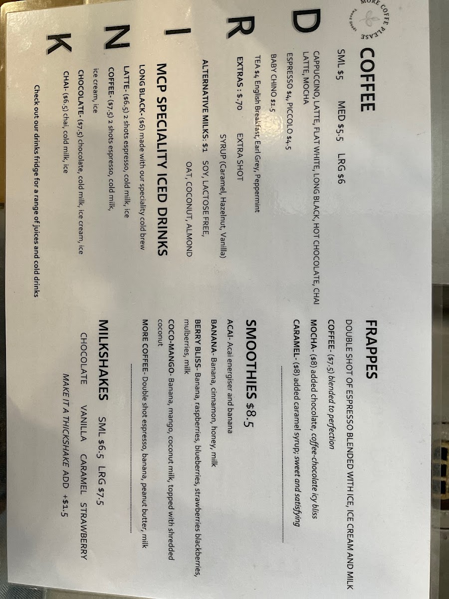 Located in the vibrant Wharf Central, More Coffee Please is a café that promises a delightful experience for coffee lovers and foodies alike. With a menu that allows guests to create their own salads and a diverse range of specialty iced drinks—including rich Long Blacks and creamy Lattes—this café caters to every palate. The frappes, featuring enticing flavors like Caramel and Mocha, stand out as refreshing treats for warm days.